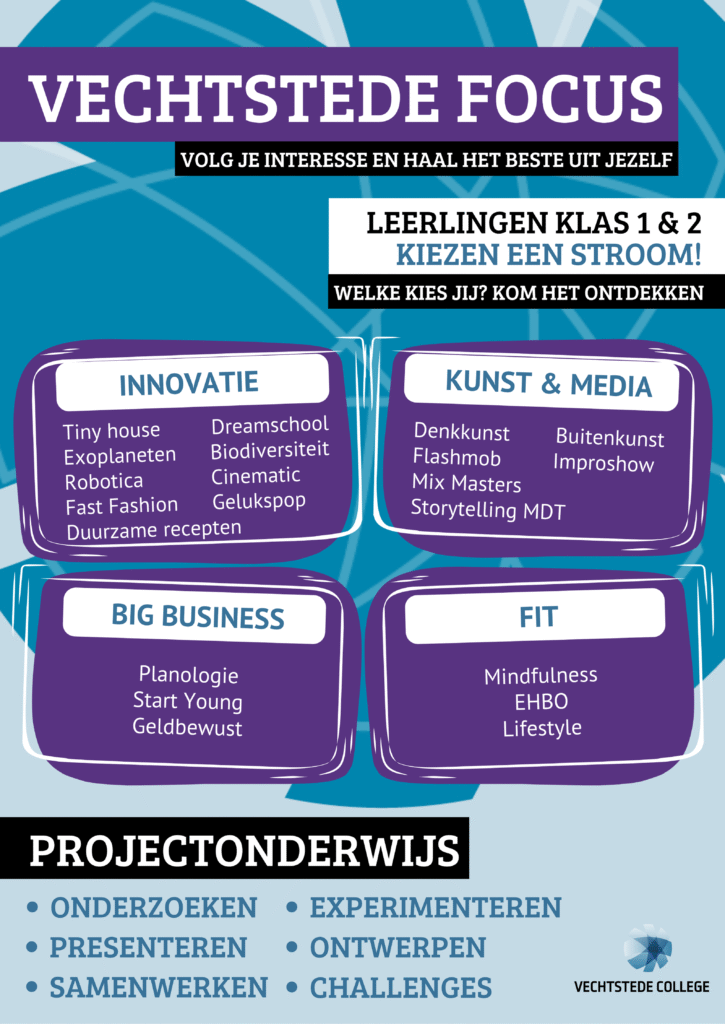 Je gaat je interesses verkennen en je talenten ontwikkelen. Ben jij enthousiast over robotica, mindfulness, het opzetten van je eigen bedrijf of sta je liever op het podium? Het kan allemaal binnen Vechtstede Focus!